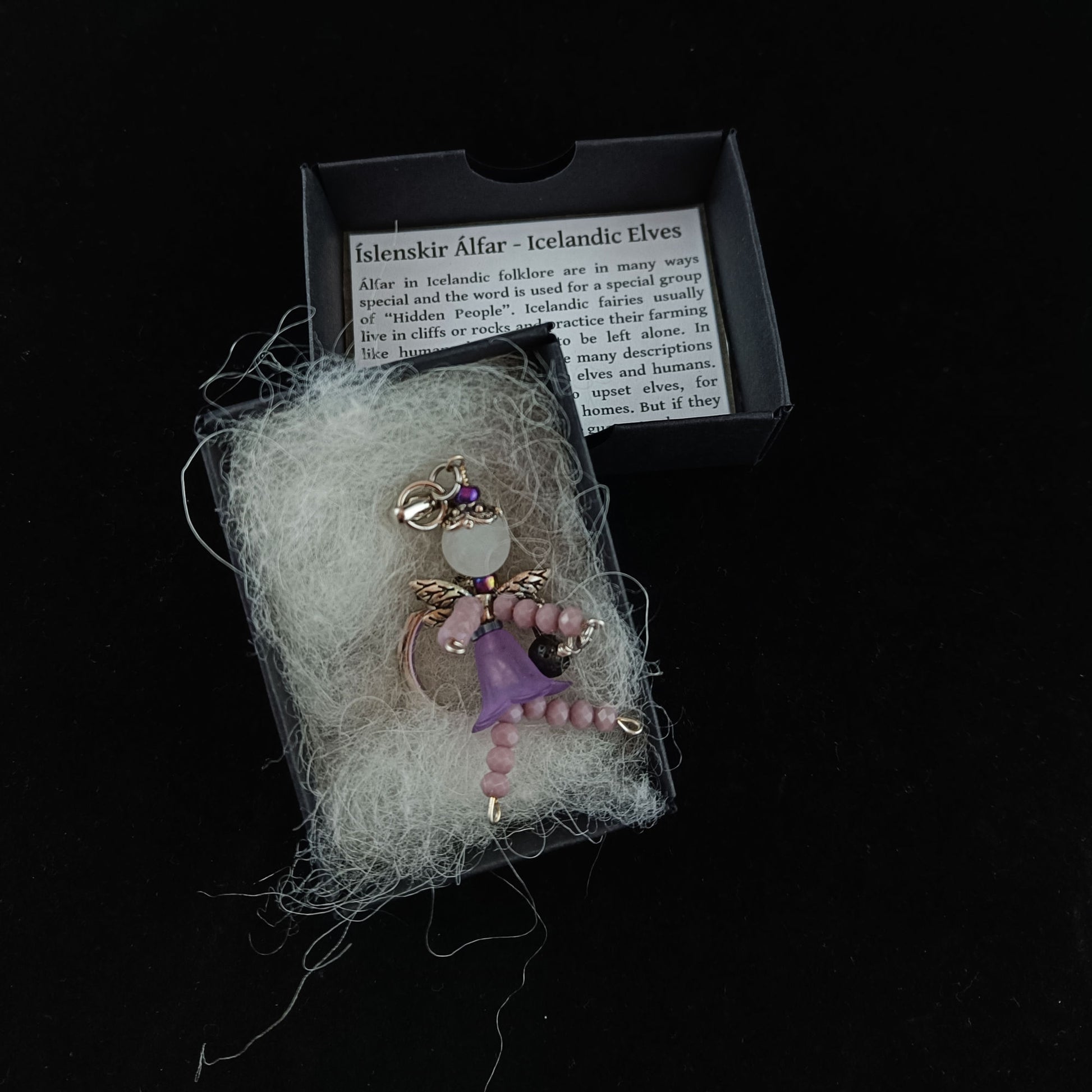 Each Fairy comes in a black gift box with Icelandic sheep wool and the Icelandic flag. There is an inlay with a short description about the Icelandic Álfar.