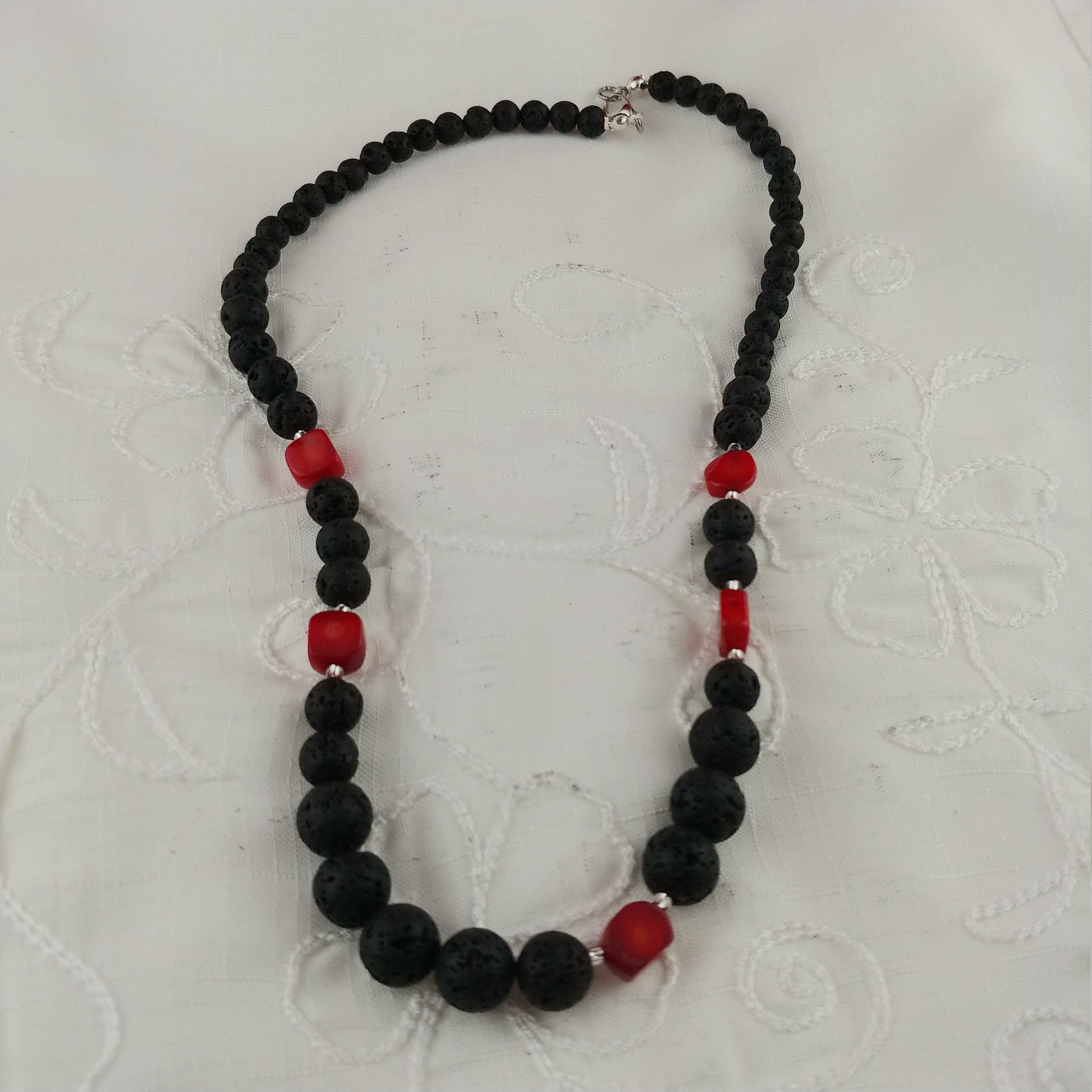 An Exquisite Lava Necklace with Red Coral Stones. A beautiful combination of dark red colors and the black color of the lava.