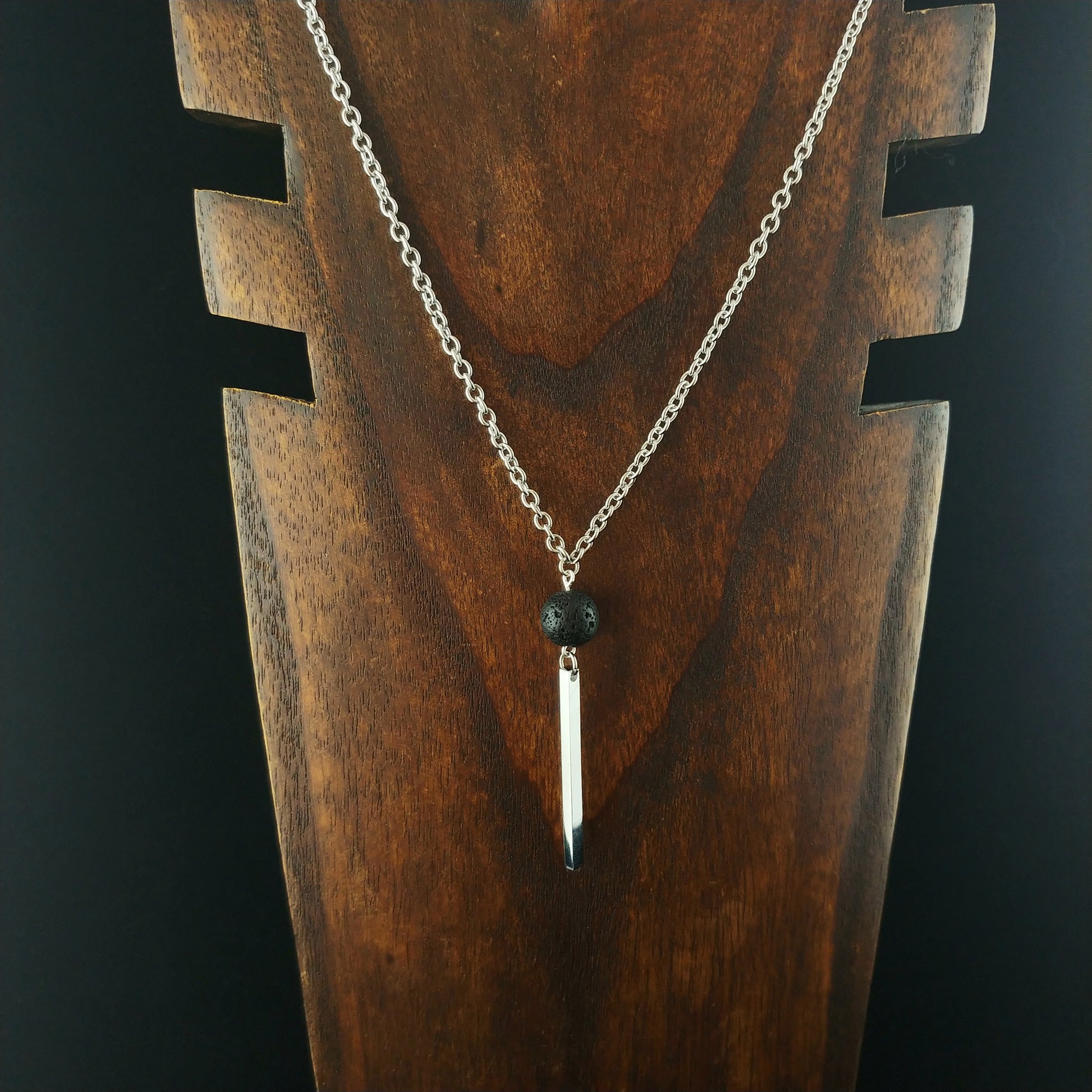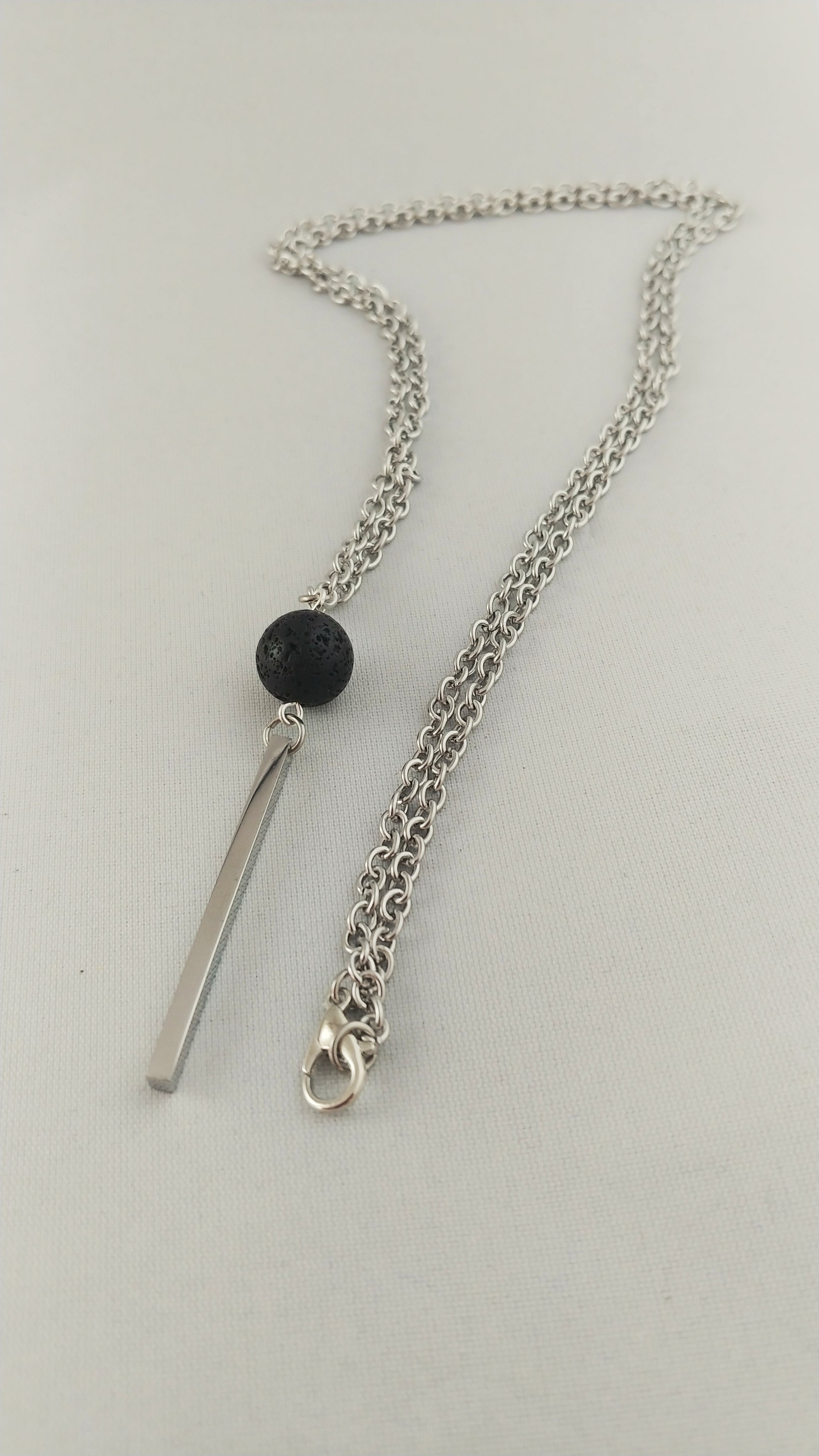 Silver Stainless Steel Necklace with a Lava and Silver bar Pendant.