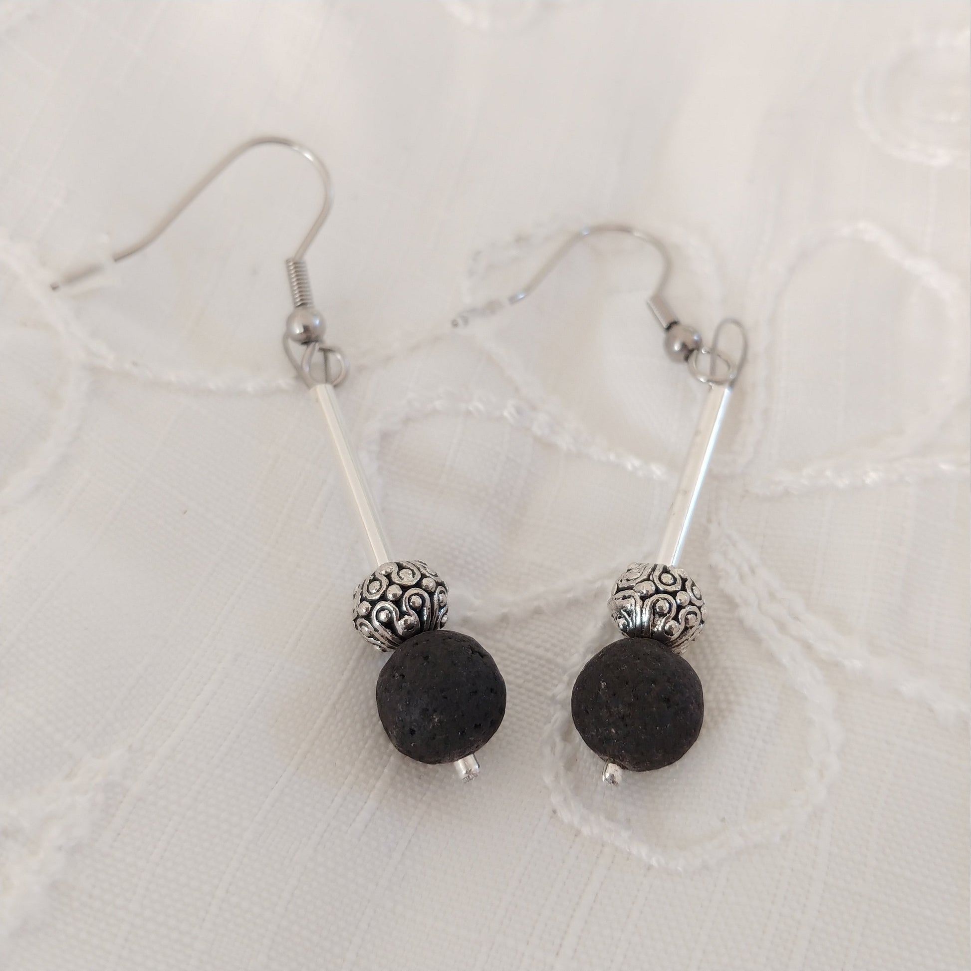 Lava Rock Silver Tube Earrings with Beautiful Round Spacer Bead