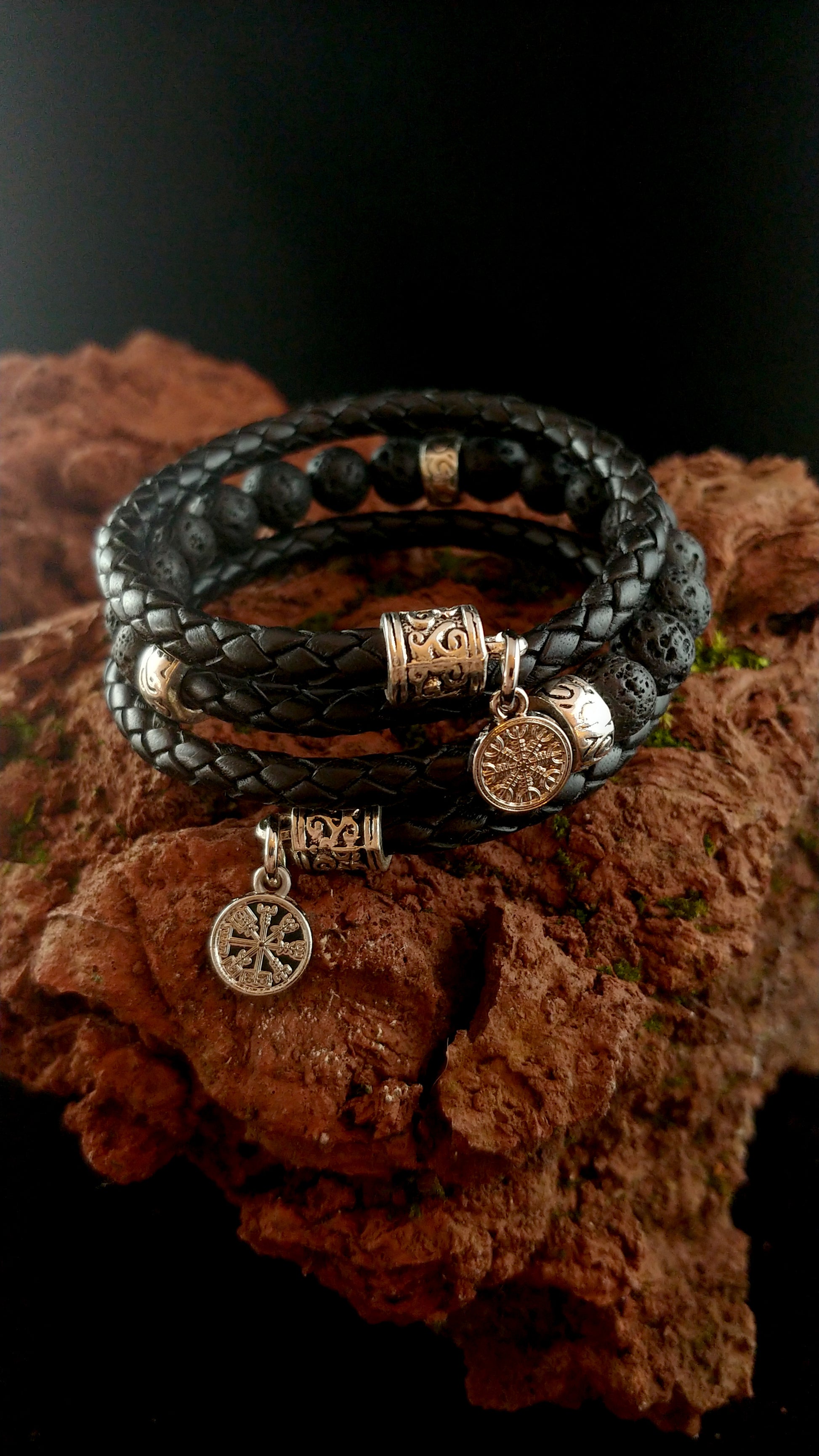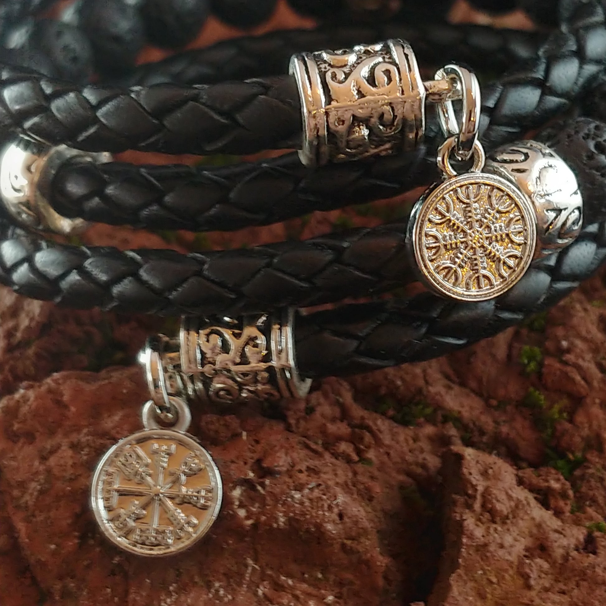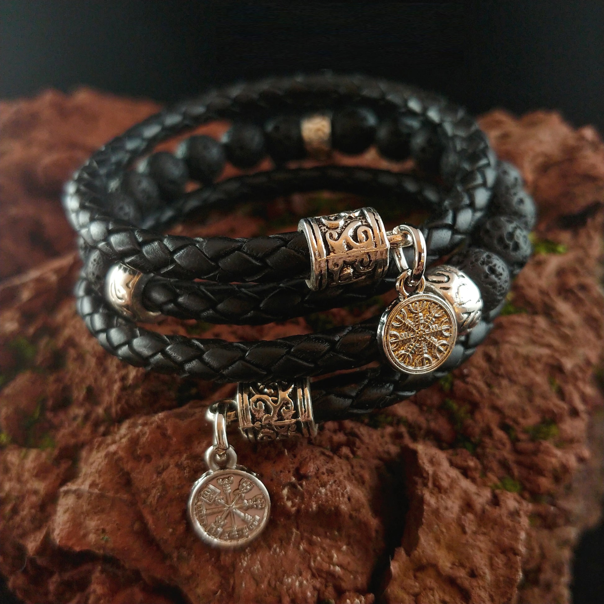 Wrapped Leather Lava Bracelet with Steel Vegvísir and Ægishjálmur charms