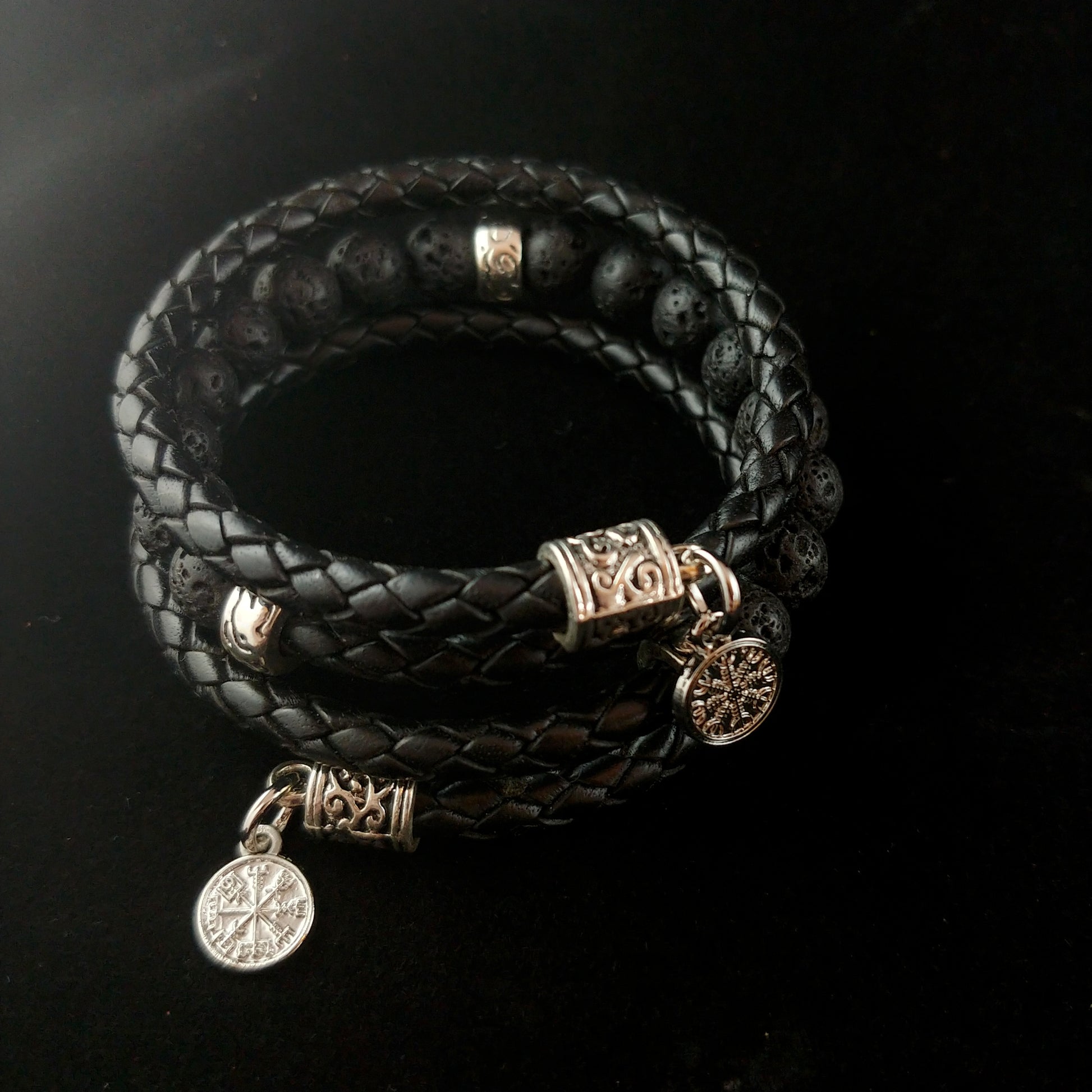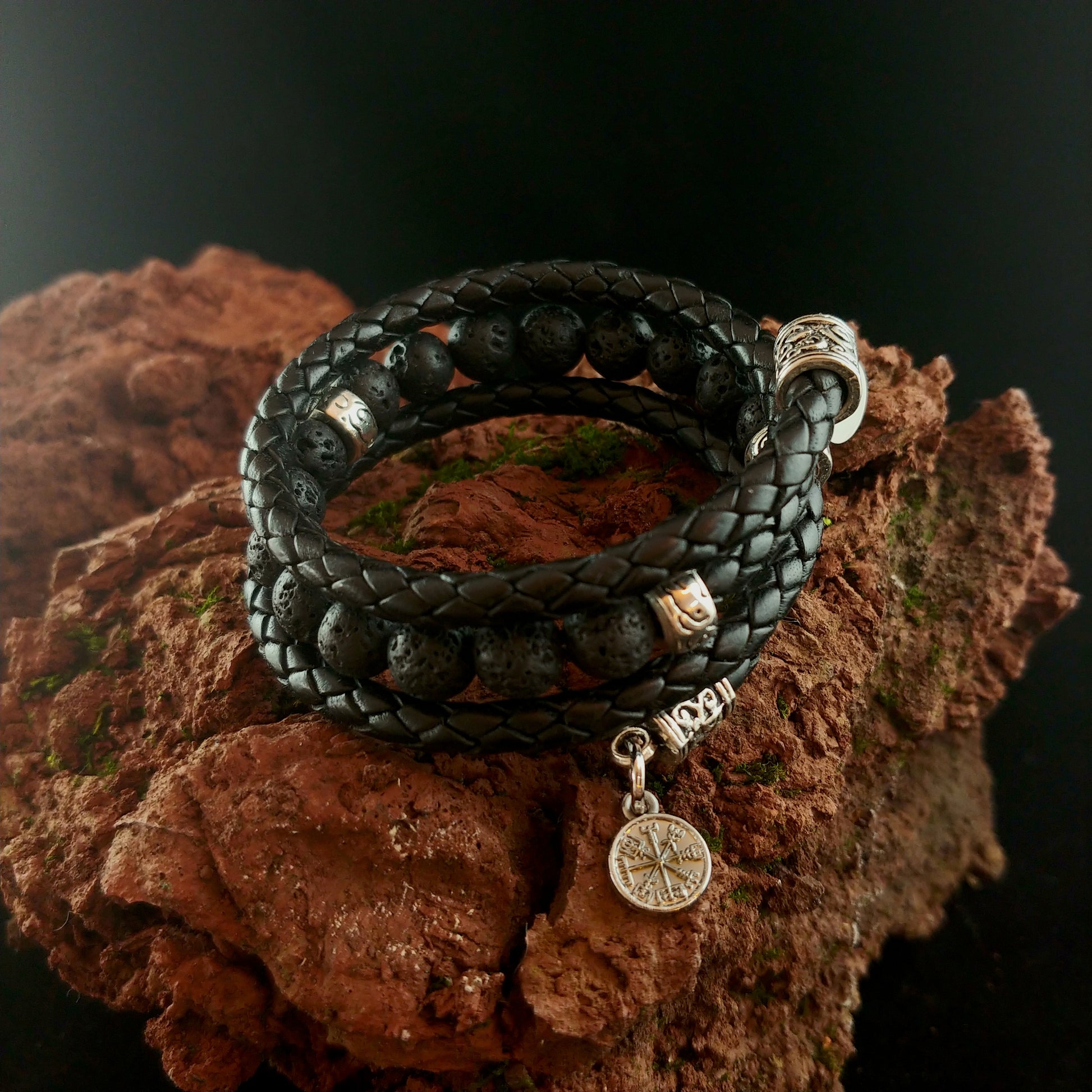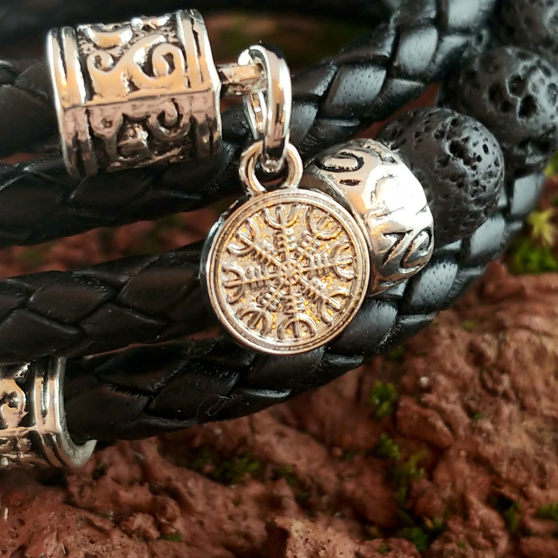 Wrapped Leather Lava Bracelet with Steel Vegvísir and Ægishjálmur charms